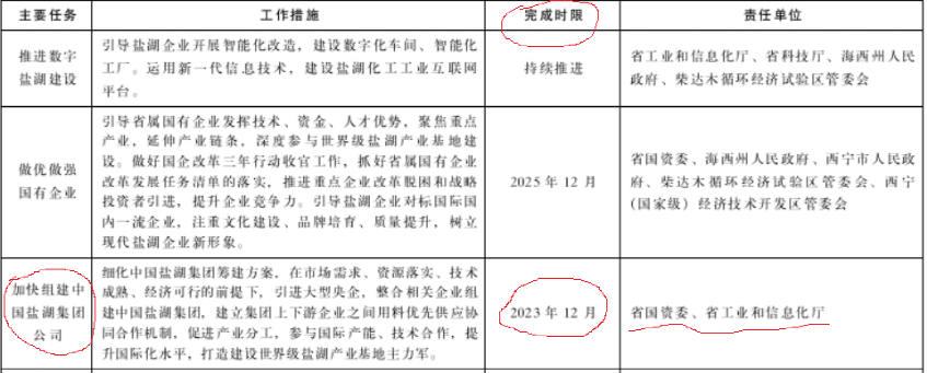 从任务分工表来看,组建中国盐湖集团的完成时限是2023年12月,责任单位是青海省国资委和青海省工业和信息化厅。