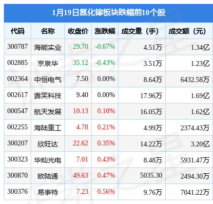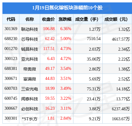 1月19日氮化镓板块较上一交易日上涨1.9%,联动科技领涨。当日上证指数报收于3240.28,上涨0.49%。深证成指报收于11913.26,上涨0.87%。氮化镓板块个股涨跌见下表: