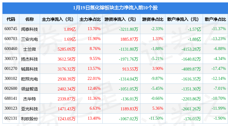 从资金流向上来看,当日氮化镓板块主力资金净流入5.45亿元,游资资金净流出1.43亿元,散户资金净流出4.02亿元。氮化镓板块个股资金流向见下表:
