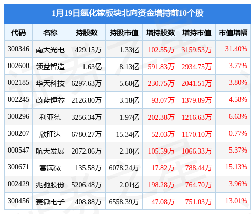 北向资金方面,当日氮化镓板块北向资金持股市值为111.92亿元,增持1.84亿元。其中增持最多的是南大光电(300346),增持了0.32亿元。减持持最多的是士兰微(600460),减持了0.15亿元。氮化镓板块北向资金持股变动明细见下表: