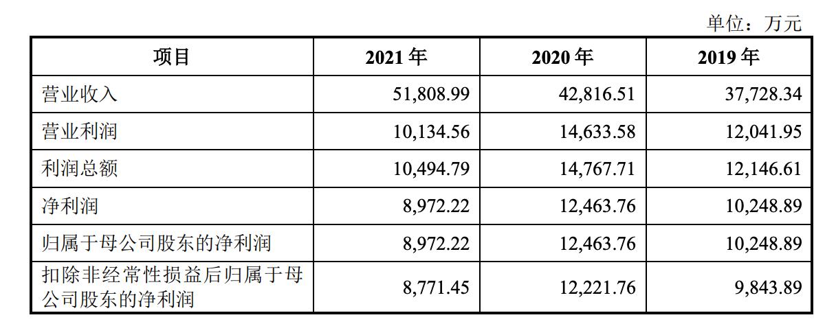 综合两版招股书可知,2017年至2021年,恒兴科技分别实现营业收入4.37亿元、4.40亿元、3.77亿元、4.28亿元、5.18亿元,总体上呈稳步上升;分别实现归母净利润0.48亿元、0.74亿元、1.02亿元、1.25亿元、0.9亿元,2021年净利润同比降幅接近3成,几乎退回2018年水平。