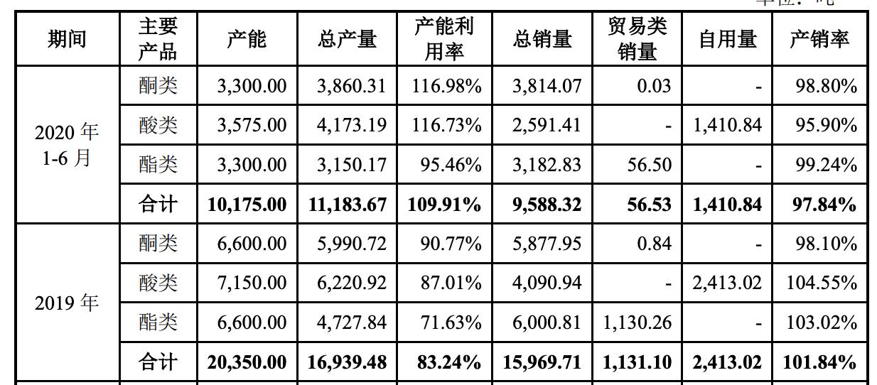 具体的,沪市主板招股书产能为2.62万吨(包括酮类5200吨、酯类1.1万吨、酸类1万吨),产量为1.7万吨(包括酮类6080.63吨、酯类4727.84吨、酸类6177.42吨),产能利用率为64.83%(包括酮类116.94%、酯类42.98%、酸类61.77%)。